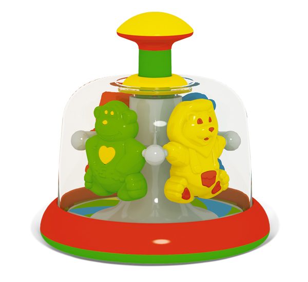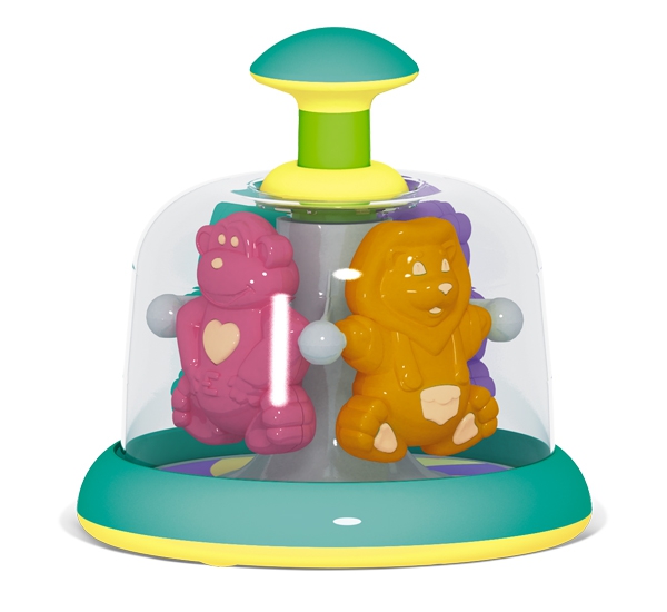 Наша юла заводится легким нажатием на рукоятку, что доступно даже младенцам. От прикосновений малыша запускается карусель под прозрачным куполом. Малыш может наблюдать за движением фигурок, влиять на их скорость и слушать звуки.